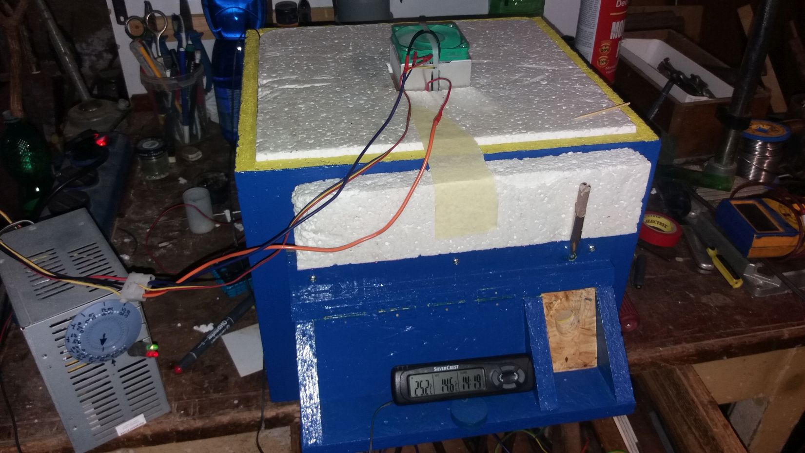 Pepane, super fotoseriál. Polystyren sám o sobě celkem smrdí, takže povrchová úprava je na místě. Topení se mi líbí a při mém bastlení chlazení bych ho chtěl taky zakomponovat. Co se spotřeby týče, tak ho u chlazení o 5 - 8 °C pod venkovní tepotu odhaduji na 40 watů. K regulaci chlazení jsem použil už hotový termostat, který umožňuje požadovanou teplotu nastavit přímo ve stupních Celsia a zároveň ji i zobrazuje. Přesnost měření je na hranici použitelnosti ale jde přepnout do režimu chlazení i topení, má nastavitelnou hysterezi a dalši funkce. https://aukro.cz/digitalni-termostat-te ... 6922606990 . Měl bych už jeden funkční kousek, ale zkoušel jsem jak moc se přenáší hluk větráčku do vnitřku čmelína a trochu mě to překvapilo. Venku není skoro slyšet, ale když přiložím ucho na korpus, tak je to celkem hlučné i při nižších otáčkách ventilátoru. Takže ještě zkusím odhlučnit ventilátor nebo chlazení velkým Al profilem bez ventilátoru. Nevím jak dalece by čmeláky hluk stresoval.