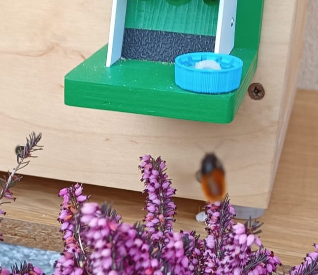 Dnes ráno byl běžný pohyb čmeláčí matky, viděla jsem ji, jak vyletěla ráno ven. Přivezli jsme nějaké nové květiny ze zahradnictví vhodné pro čmeláky, které jsem dala před čmelín a na nich jsem viděla hned čmeláky. Později jsem viděla jak nějaký čmelák se pokouší dostat do úlu, hledá vletový otvor pod střechou a v místech, kde není. A teď jsem zjistila, že vletový otvor je ucpaný.